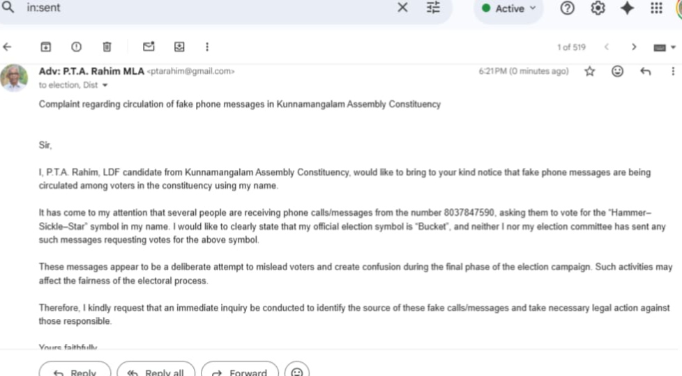 എന്നാല്‍ തന്‍റെ തെരഞ്ഞെടുപ്പ് ചിഹ്നം ബക്കറ്റാണെന്നും, ചുറ്റിക-അരിവാള്‍-നക്ഷത്രം ചിഹ്നത്തില്‍ വോട്ട് ചെയ്യണമെന്ന് ആവശ്യപ്പെടുന്ന സന്ദേശങ്ങള്‍ താനോ തന്‍റെ തെരഞ്ഞെടുപ്പ് കമ്മറ്റിയോ അയച്ചിട്ടില്ലെന്നും അദ്ദേഹം വ്യക്തമാക്കി. തന്‍റെ പേരും ചിഹ്നവും ഉപയോഗിച്ച് വ്യാജ സന്ദേശങ്ങള്‍ പ്രചരിപ്പിക്കുന്ന സാഹചര്യം വോട്ടര്‍മാരില്‍ ആശയക്കുഴപ്പം സൃഷ്ടിക്കുന്നതിന് ഇടയാക്കുമെന്ന് അദ്ദേഹം വ്യക്തമാക്കി. 8037847590 എന്ന നമ്പറില്‍ നിന്നാണ് ഇപ്പോള്‍ വ്യാജ സന്ദേശം വന്നിട്ടുള്ളത്. ഇതിന്‍റെ ഉറവിടം കണ്ടെത്തി ഉത്തരവാദികളായവര്‍ക്കെതിരെ നടപടി സ്വീകരിക്കണമെന്നും പി.ടി.എ റഹീം തെരഞ്ഞെടുപ്പ് കമ്മീഷനോട് ആവശ്യപ്പെട്ടു. കൂടാതെ ഘടകകക്ഷി നേതാക്കളെ പാര്‍ട്ടി ഫണ്ട് വാഗ്ദാനം ചെയ്ത് സ്വാധീനിക്കുവാനുള്ള ശ്രമങ്ങളും ശ്രദ്ധയില്‍ പെട്ടിട്ടുണ്ടെന്നും അദ്ദേഹം വ്യക്തമാക്കി.