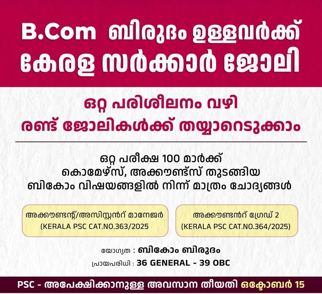 ബികോം ബിരുദം ഉള്ളവർക്ക് കേരള സർക്കാർ ജോലി.
