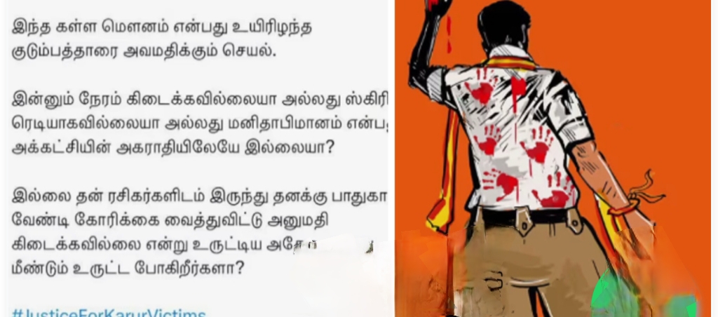 രക്തം നിറത്തിൽ കൈപ്പത്തി അടയാളങ്ങളും പതിപ്പിച്ചിട്ടുണ്ട്. കരൂര് ഇരകളെ വിജയ് അപമാനിക്കുകയാണെന്നാണ് എക്സ് പോസ്റ്റിൽ ഡിഎംഎകെയുടെ വിമര്ശനം. ഡിഎംകെ ഐടി വിങ് ആണ് എക്സ് പോസ്റ്റ് പങ്കുവെച്ചിരിക്കുന്നത്. കരൂര് ദുരന്തമുണ്ടായി 20 ദിവസം കഴിഞ്ഞിട്ടും വിജയ് കരൂരിൽ പോയില്ലെന്നും തിരക്കഥ ശരിയായില്ലേ എന്നും പരിഹസിച്ചു. അനുമതി കിട്ടിയില്ലെന്ന പതിവ് ന്യായമാണോ ഇപ്പോഴും പറയാനുള്ളതെന്ന ചോദ്യവും ഡിഎംകെ ഉയര്ത്തുന്നുണ്ട്.